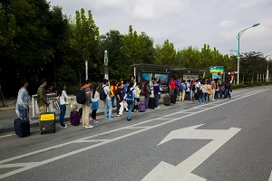 从上午9点半开始,爱心社成员就出现了南邮门口的公交车站。同学们穿上红马甲后就积极开展工作,无论是举牌引导乘客排队,还是主动帮有需要的乘客提行李,他们都不怕累、不怕苦,体现了南京邮电大学学子吃苦耐劳的精神。在红马甲们的热情帮助下,乘客们有序地上车,即使是人最多的97路公交,秩序也丝毫不乱。红马甲们维持公交站秩序,用微笑传递乘车文明,用服务散播国庆快乐,一个手势,一个问候,一个提醒,都彰显了一个爱与爱交织的日子,安全你我他,幸福回到家。长队,人群,行李,回家的节奏,但更惹目的是那一个个红色的背影,默默无闻,敢于奉献,不怕行李的笨重,只怕同学们等不到车的焦急;不怕骄阳的赤烈,只怕同学们错过时间的愁苦。