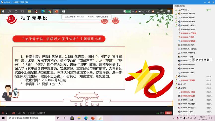此外,各支部团支书给同学们介绍了“柚子青年说”主题演讲比赛的具体细则,充分调动支部成员参与活动的积极性,推选部分优秀作品参加院赛,响应学校过好寒假的倡议。