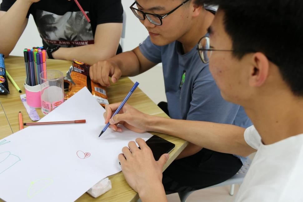 经过20分钟的创作,每个小组绘制出各自别具特色的画作,其中“我们说的都对”小组给大家介绍道,图画中的六边形所代表的是我们面前的桌子,每一条边上的图案指代的是每个成员,大家画下内心对于美好事物的期待,我们用《摩尔庄园》命名,是希望每个人都能够保持一个童心,不受外物所纷扰;