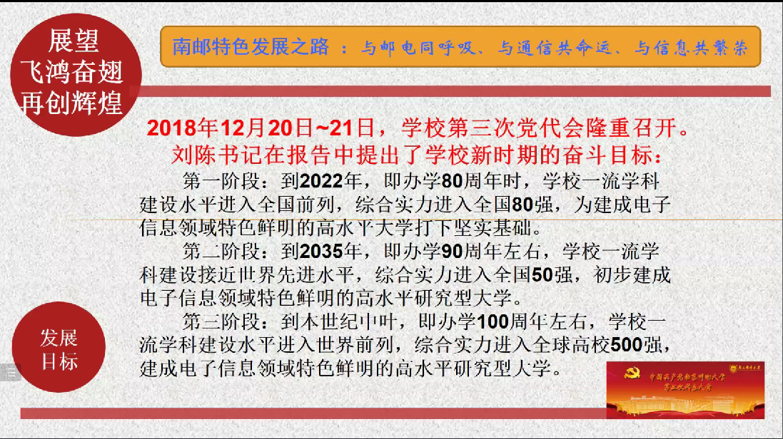 颜老师以“四月始源”开篇,讲述了我校校庆日、校庆周、校庆月的由来,而后就“红色印记史久源悠”为大家介绍了我校的办学历程和突出成绩。我校在全国各所大学中因为有着红色革命印记显得格外特别,新时代的南邮师生们更是秉持着“厚德弘毅、求实笃行”的原则,展现着南邮风采。