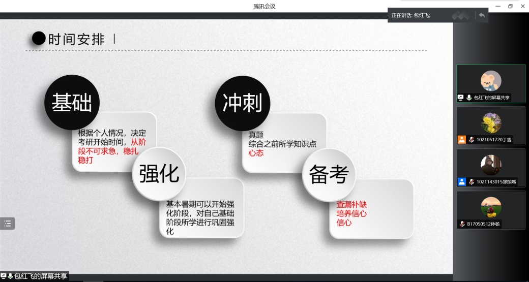 其次,包红飞学长则从确定考研目标、考研复习安排、考研复习、心态调整、复试准备这五大方面分享了自己的经验与心得。让同学们对考试科目有了更深入的了解,对复习时间安排有了更清晰的想法,在教材选择上也得到了有效的建议。