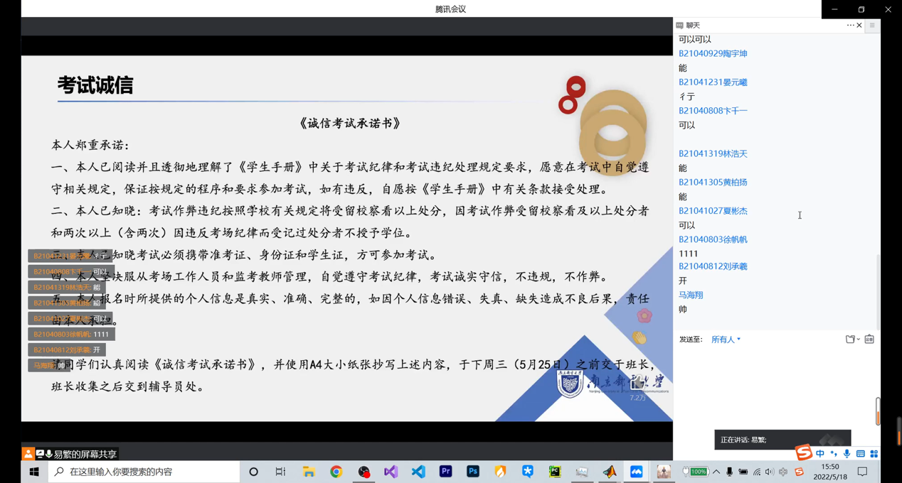 5月18日,英国威廉希尔公司官网2021级采用线上班会方式,召开诚信教育大会,严格落实考风考纪教育和诚信教育要求。2021级辅导员郑春春、谢子行、范艺分别进行主持,为2021级同学们带来一堂精彩的诚信教育课程。